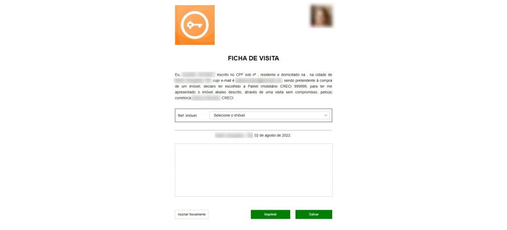 Indispensável, a Ficha de Visita é um documento gerado de forma rápida e fácil no Painel Imobiliário, podendo ser impressa ou digital, com assinatura física ou também na tela, utilizando o próprio dedo.