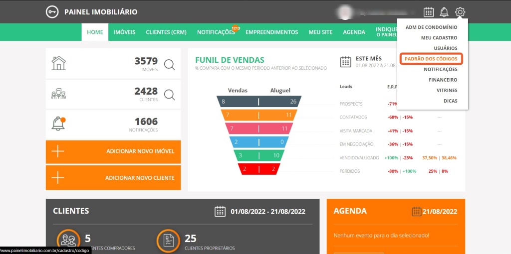 - No seu Painel Imobiliário, através do acesso de usuário MASTER, passe o mouse sobre a engrenagem da direita superior da tela. Escolha o item “PADRÃO DOS CÓDIGOS”